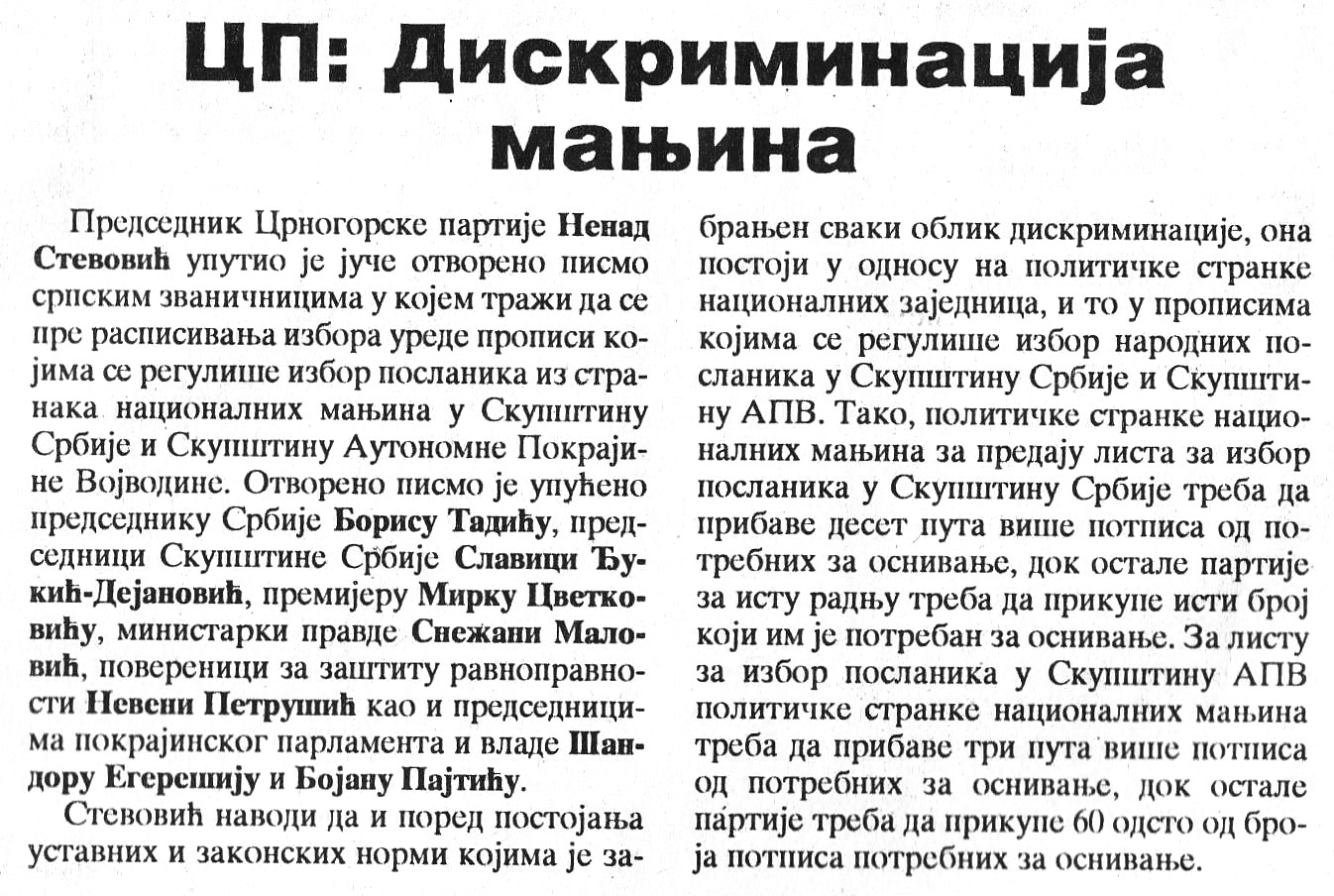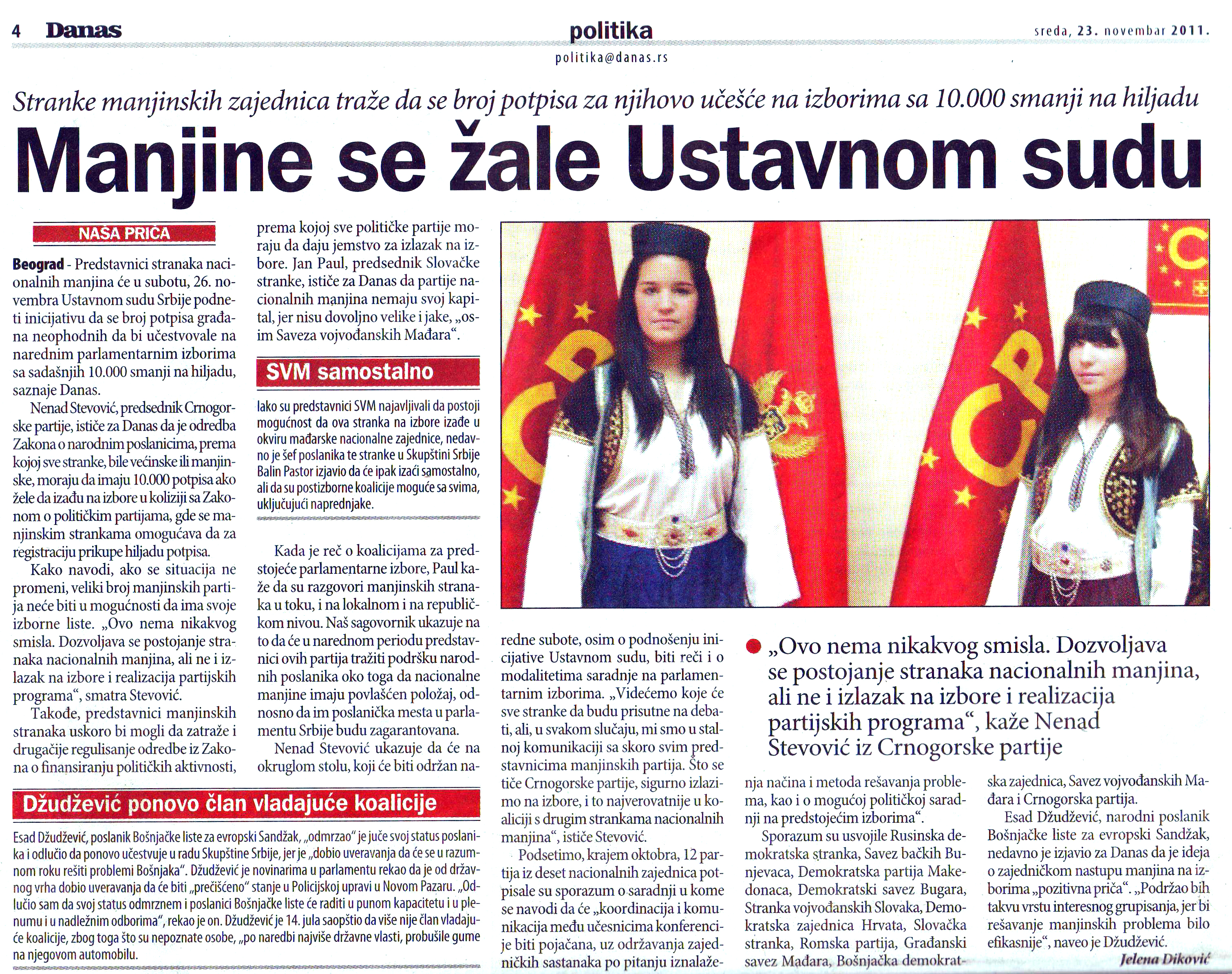 Zatražili su mišljenje od Nacionalnog savjeta, koji u potpunosti kontrolišu SNS i SPS, o tome “da li Izborna lista Crnogorske partije može imati položaj izborne liste nacionalne manjine”. Cilj je jasan, želi se po svaku cijenu spriječiti izlazak Crnogorske partije na lokane izbore u opštini Mali Iđoš u kojoj su predate samo dvije izborne liste, i to koalicije SNS i SPS i lista Saveza vojvođanskih Mađara (SVM).