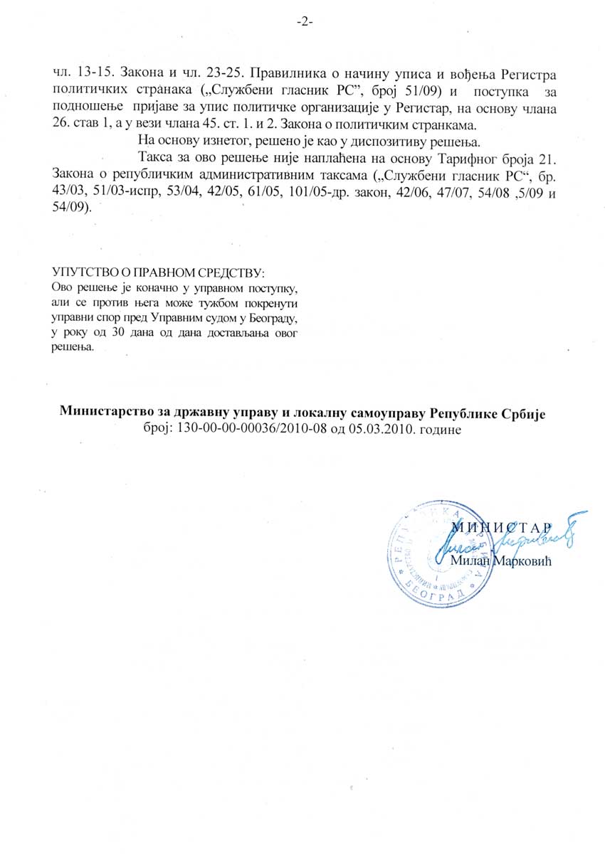 Rješenjem Ministarstva za državnu upravu i lokalnu samoupravu Republike Srbije od 05.03.2010. godine Crnogorska partija je uspješno obavila proces preregistracije.