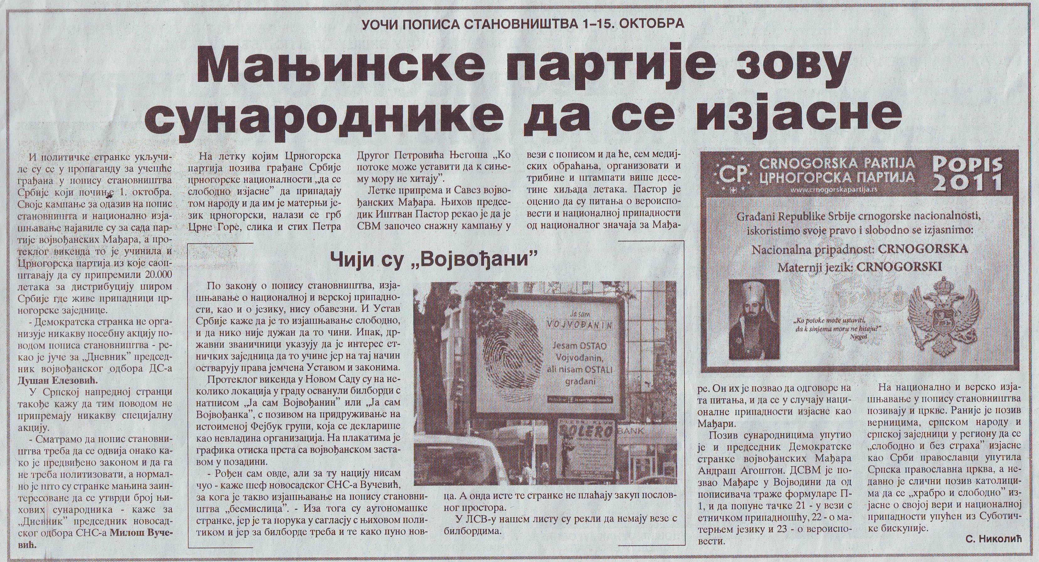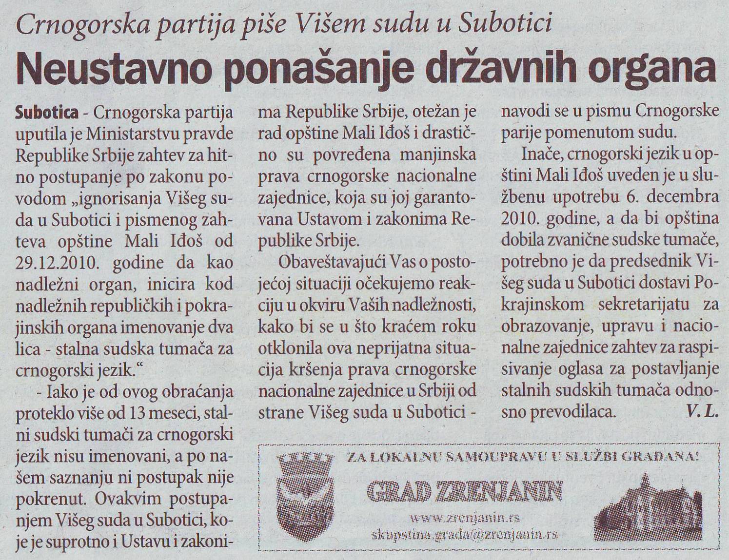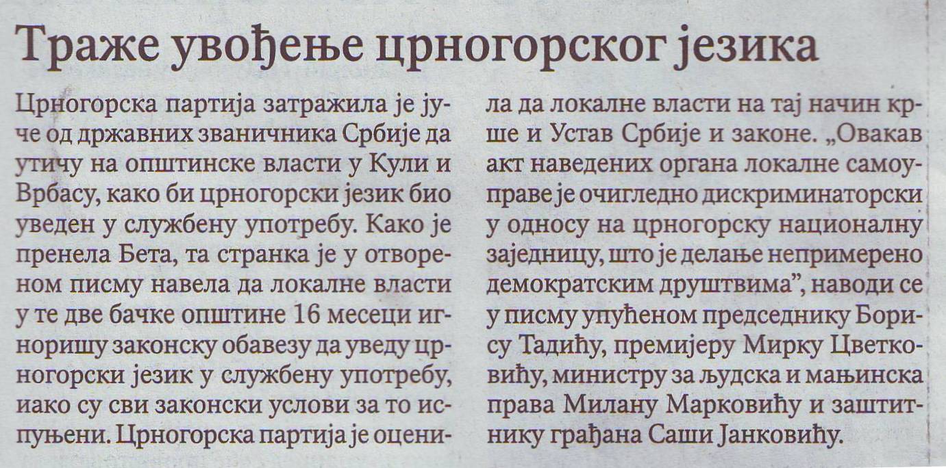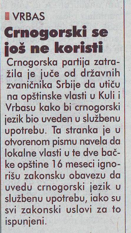 - Da li će do Popisa stanovništva crnogorski jezik biti uveden u službenu upotrebu na teritoriji opštine Vrbas, imajući u vidu da su već 12 godina ispunjeni svi zakonom propisani uslovi? Ili se čeka popis da se broj Crnogoraca u toj opštini spusti ispod 15% i tako se izgubi pravo, da pored srpskog, mađarskog i rusinskog, u Vrbasu bude službeni i crnogorski jezik?