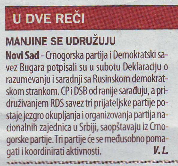 Crnogorska partija je odbila prijedlog o koaliciji i načinu nastupa na parlamentarnim izborima u Srbiji koji joj je ponuđen nakon razgovora sa vojvođanskim građanskim i manjinskim partijama okupljenih oko Lige socijaldemokrata Vojvodine.