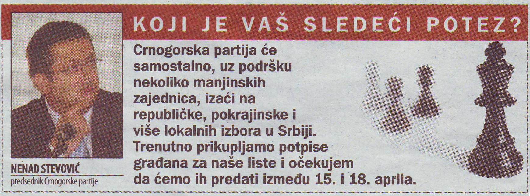 Odluku sa kojom političkom grupacijom će u koaliciji izaći na parlamentarnim izborima, kao i da li će i kojeg kandidata podržati na izborima za predsjednika Srbije, Glavni odbor Crnogorske partije će donijeti nakon završetka razgovora sa proevropskim demokratskim strankama sa kojima tradicionalno sarađuje. Razgovori se prije svega vode sa Ligom socijaldemokrata Vojvodine (LSV), Vojvođanskom partijom (VP) kao i autentičnim političkim predstavnicima nacionalnih zajednica.