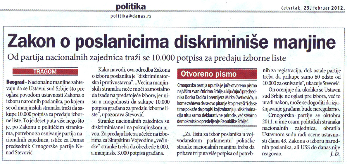 Biće interesantno na koji način će eventualnu negativnu odluku obrazložiti Dragoljub Malović SNS-ov predsjednik nacionalnog savjeta, imajući u vidu da je Crnogorska partija kao manjinska stranka u tri izborna ciklusa (2008-2020) imala odbornike u Skupštini opštine Mali Iđoš, da je u dva izborna ciklusa imala odbornike u Prokuplju, kao i odbornike u Subotici, Šapcu i Kragujevcu. Takođe Crnogorska partija je tri puta kao manjinska stranka nastupila na parlamentarnim i pokrajinskim izborima. Glasovima odbornika Crnogorske parije i SVM u opštini Mali Iđoš je 2010. godine uveden Crnogorski jezik u službenoj upotrebi.