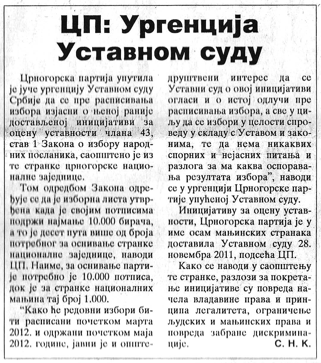 Kao autentični politički predstavnik crnogorske zajednice u Srbiji Crnogorska partija će upotrebiti sva pravna sredstva kako bi zaštitila pravo da u skladu sa zakonom nastupi na predstojećim lokalnim izborima.