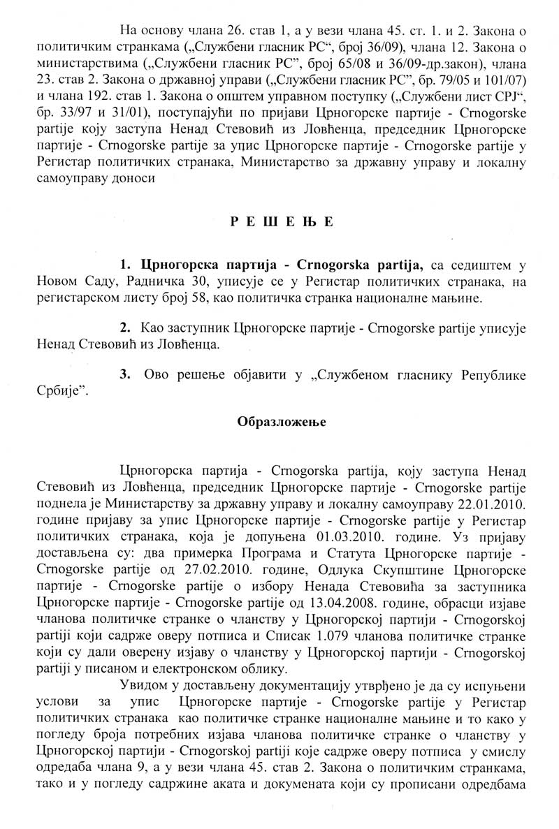 Rješenjem Ministarstva za državnu upravu i lokalnu samoupravu Republike Srbije od 05.03.2010. godine Crnogorska partija je uspješno obavila proces preregistracije.