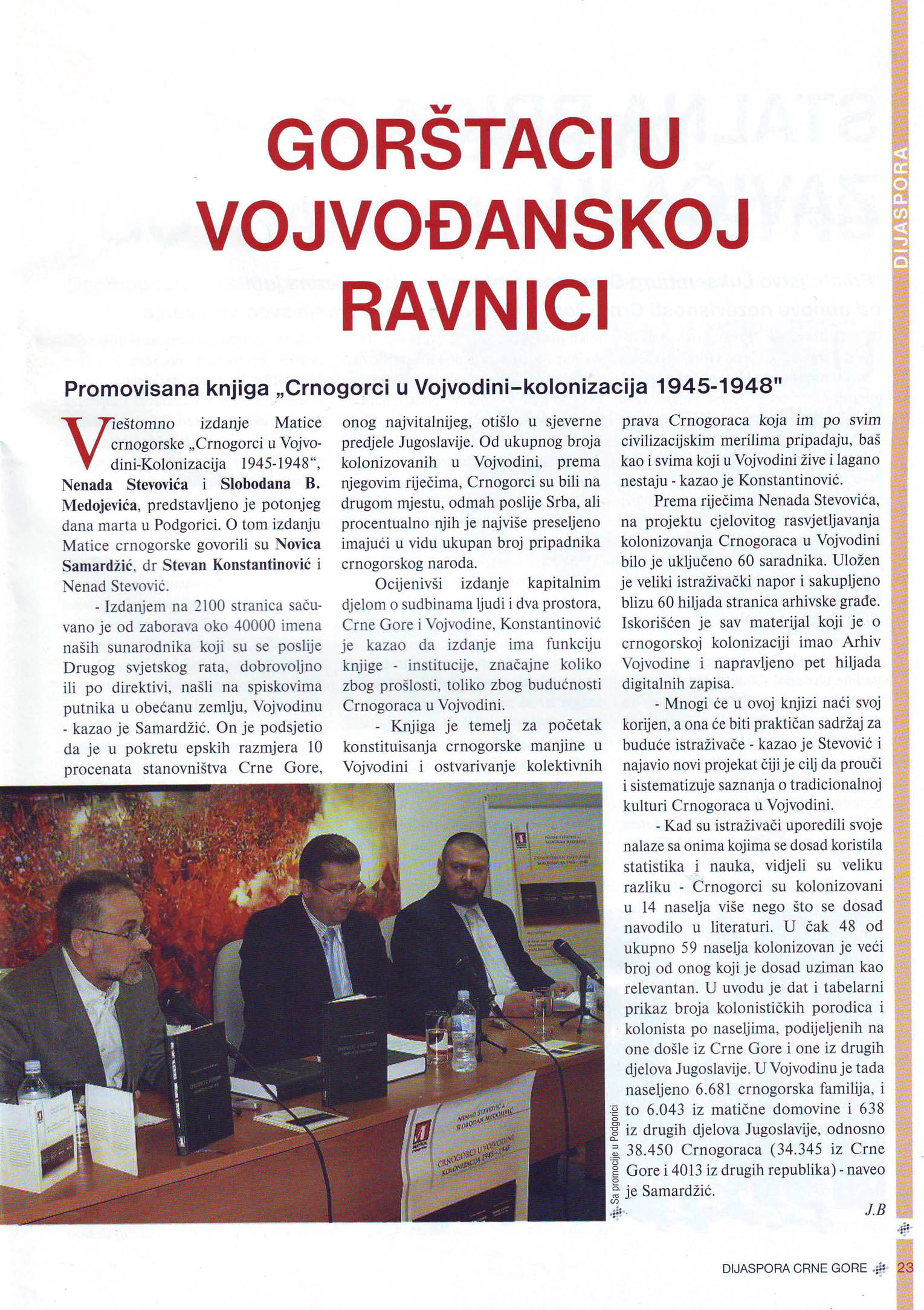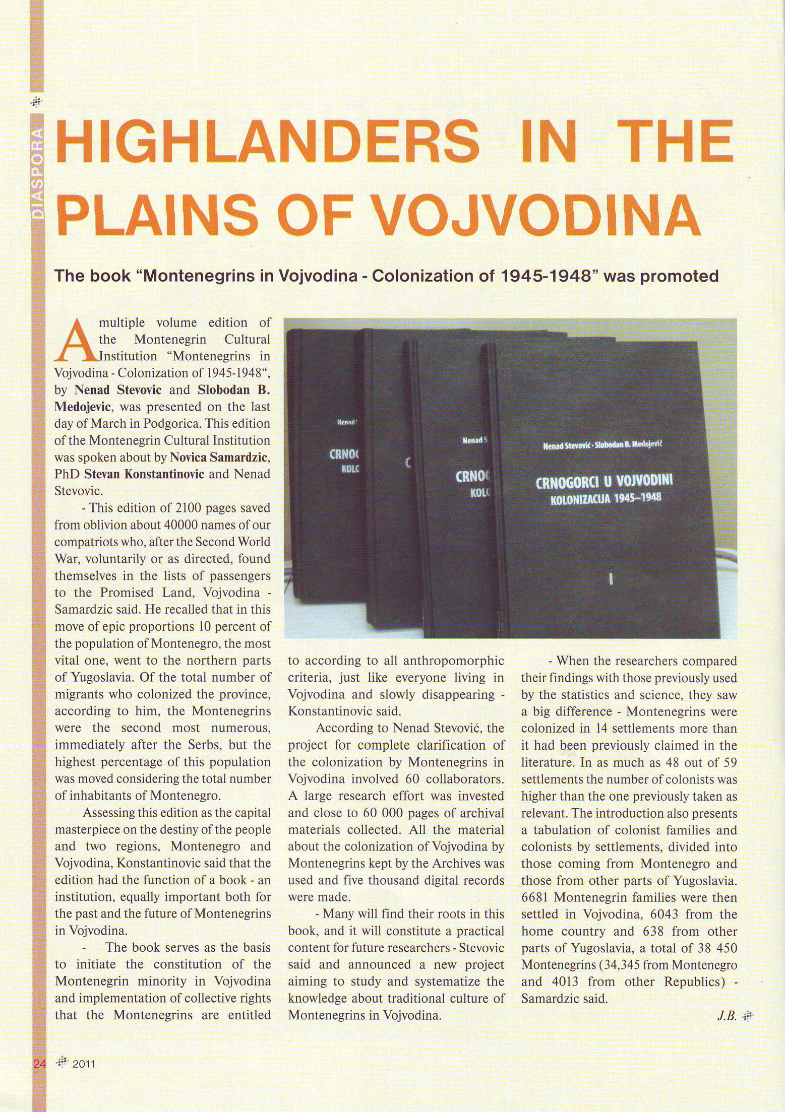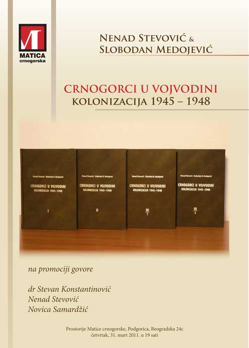 Tokom novembra i decembra u više gradova i naseljenih mjesta u Vojvodini obilježava se jubilej - 80 godina od kolonizacije Crnogoraca. Podsjećamo, u Vojvodinu je tokom procesa Agrarne reforme i kolonizacije (1945-1948) naseljeno 38450 građana sa prostora Crne Gore. Danas u njoj živi nešto više od 12.000 građana koji se izjašnjavaju kao Crnogorci.