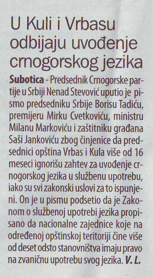 - Da li će do Popisa stanovništva crnogorski jezik biti uveden u službenu upotrebu na teritoriji opštine Vrbas, imajući u vidu da su već 12 godina ispunjeni svi zakonom propisani uslovi? Ili se čeka popis da se broj Crnogoraca u toj opštini spusti ispod 15% i tako se izgubi pravo, da pored srpskog, mađarskog i rusinskog, u Vrbasu bude službeni i crnogorski jezik?